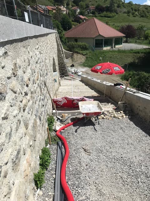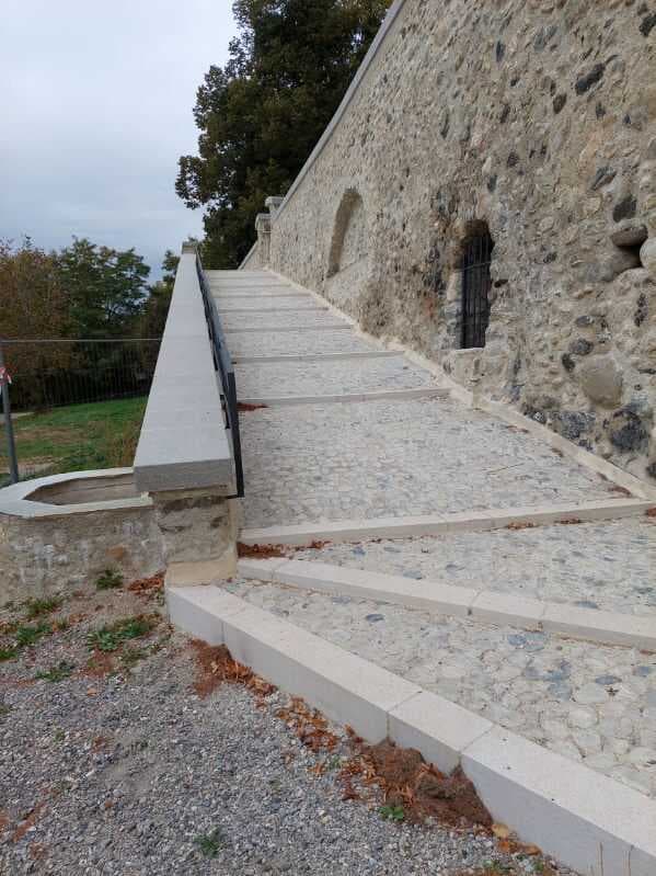 Nature des travaux : décroutage, tri des pierres, maçonnerie de parement et coulinage, fourniture et pose de pierres de taille, rejointoiement, restauration des marches, fourniture et pose de nouveaux garde-corps.